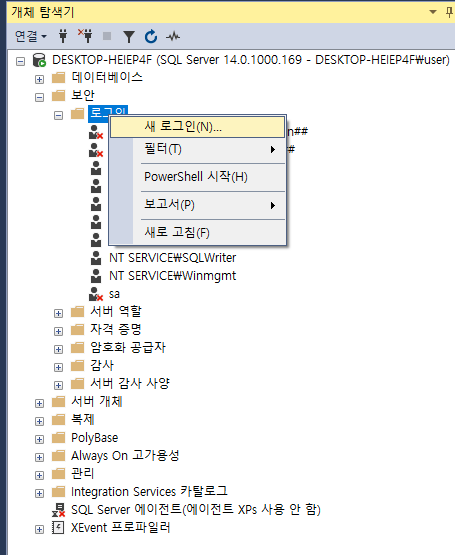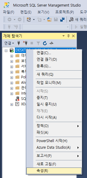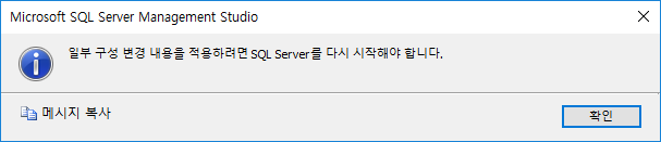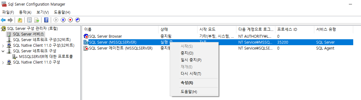 - SQL Server 서비스 -> SQL Server 우클릭 -> 다시시작