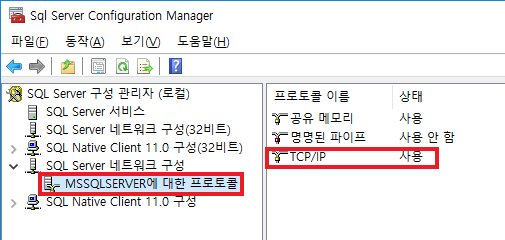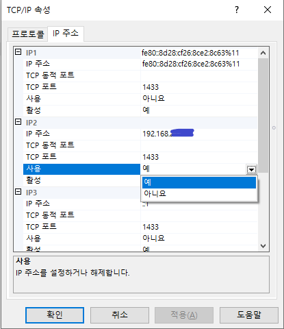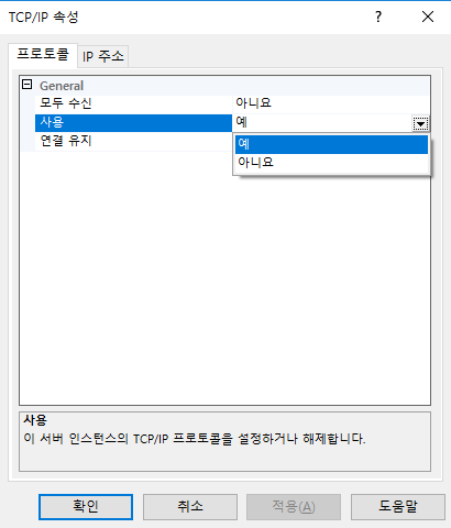 - SQL Server 네트워크 구성 -> MSSQLSERVER에 대한 프로토콜 -> TCP/IP 더블클릭