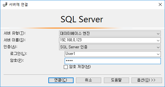 - 만약 SSMS와 SQL Server가 서로 다른 PC에 설치되어 있다면 인증을 SQL Server 인증으로 선택 해야합니다.