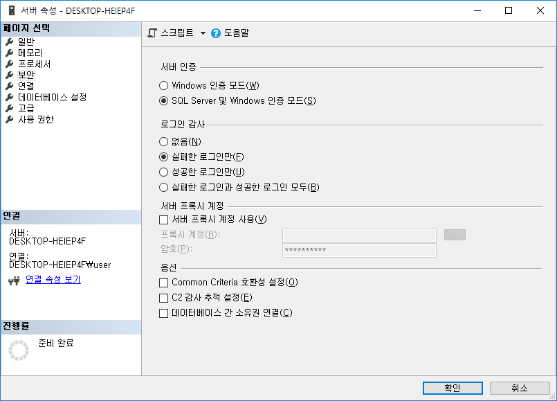 - 속성페이지에서 -> SQL Server 및 Windows 인증모드(S) 를 선택하고 확인을 누릅니다.