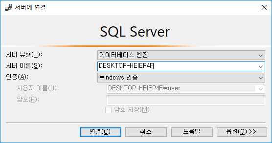 프로그램을 다시 실행하여 첫화면에서 SQL Server 인증으로 로그인을 해보겠습니다.