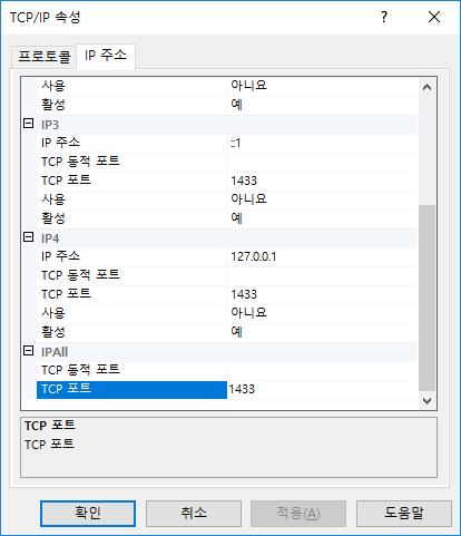 - IP 주소 탭 -> IPAll -> TCP 포트 -> 1433으로 입력 후 확인