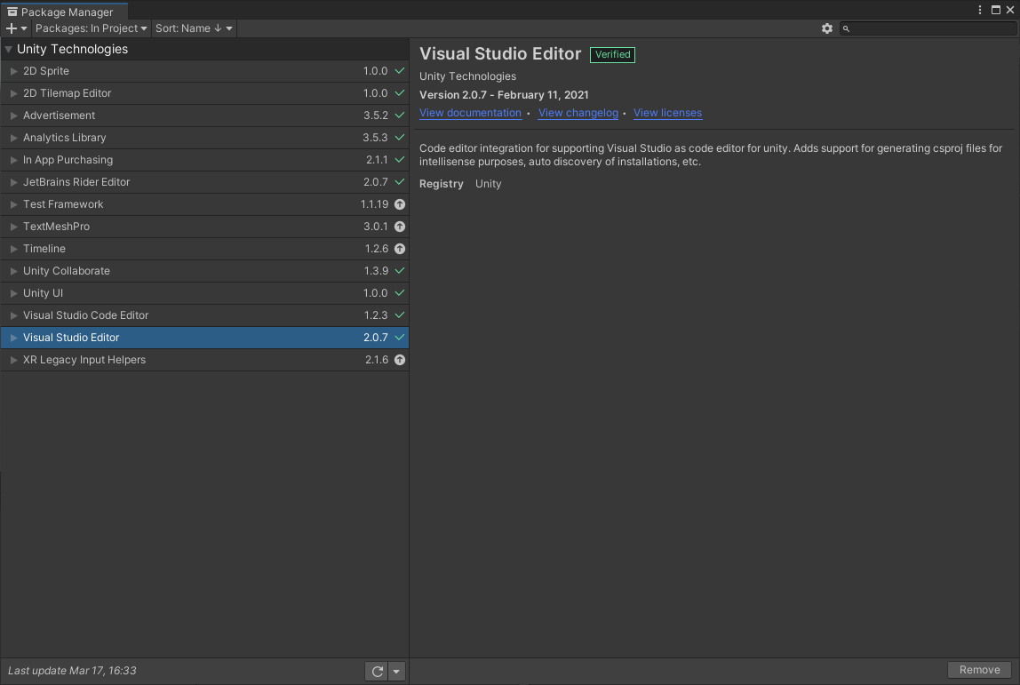 업데이트 방법 -> 유니티 툴바 Window -> Package Manager -> Visual Studio Editor -> Update