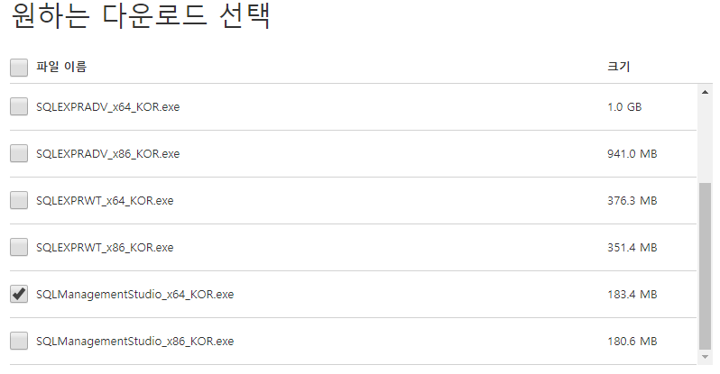 - SQLManagementStudio_x64_KOR.exe 를 선택 후 다운로드 ( 32Bit의 경우는 SQLManagementStudio_x86_KOR.exe )