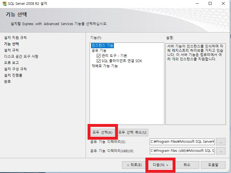 - 모두 선택 클릭 후 다음 선택 -> 설치 진행 됨
