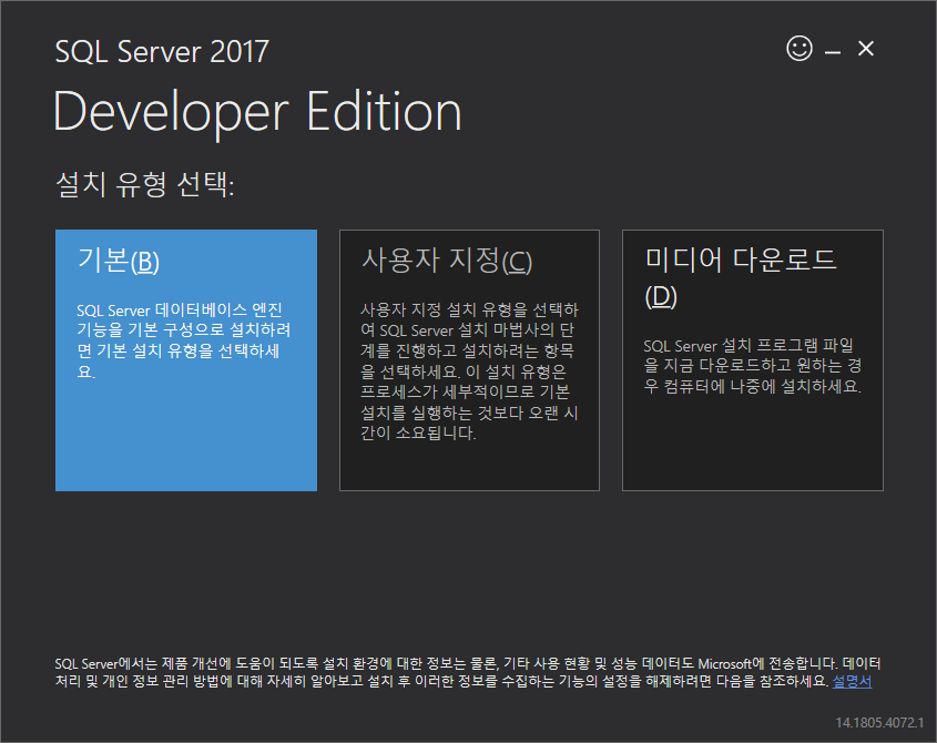 2. 다운받은 SQLServer2017-SSEI-Dev.exe 파일을 실행. ( 기본으로 설치 )